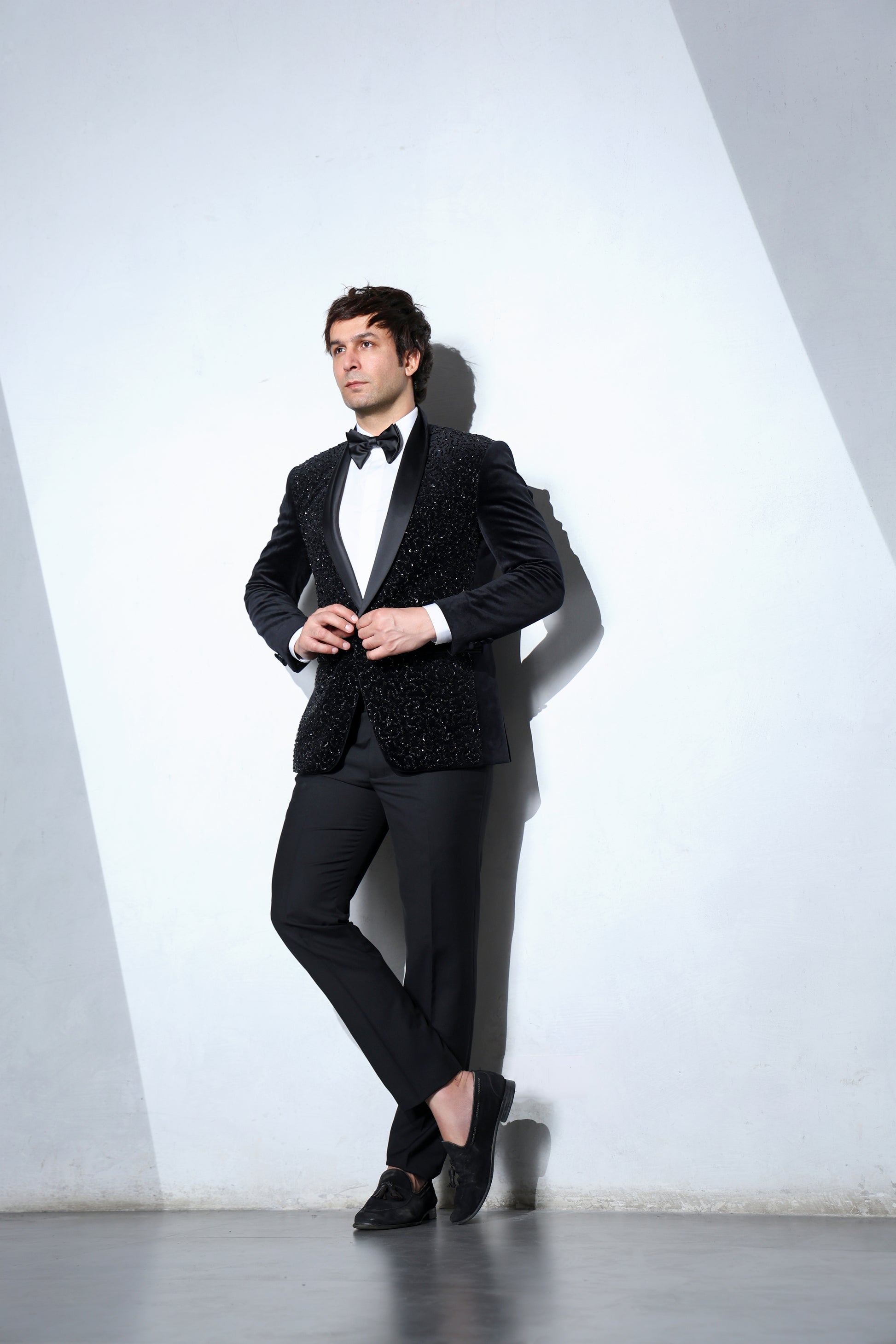 BLACK HEAVY GLASS CUT WORK TUXEDO
