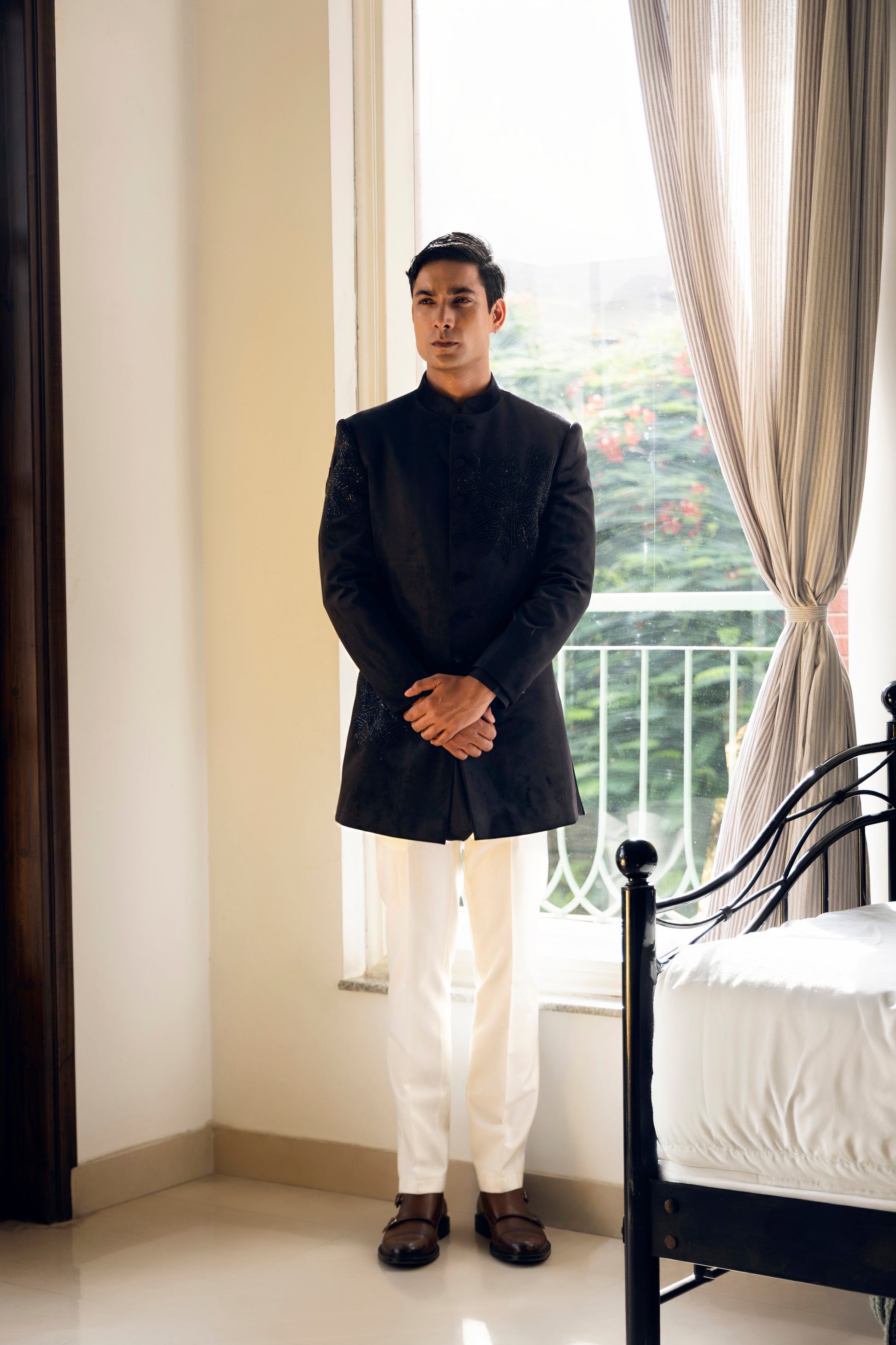 BLACK VELVET JACKET WITH OFF WHITE COTTON SILK KURTA PANT