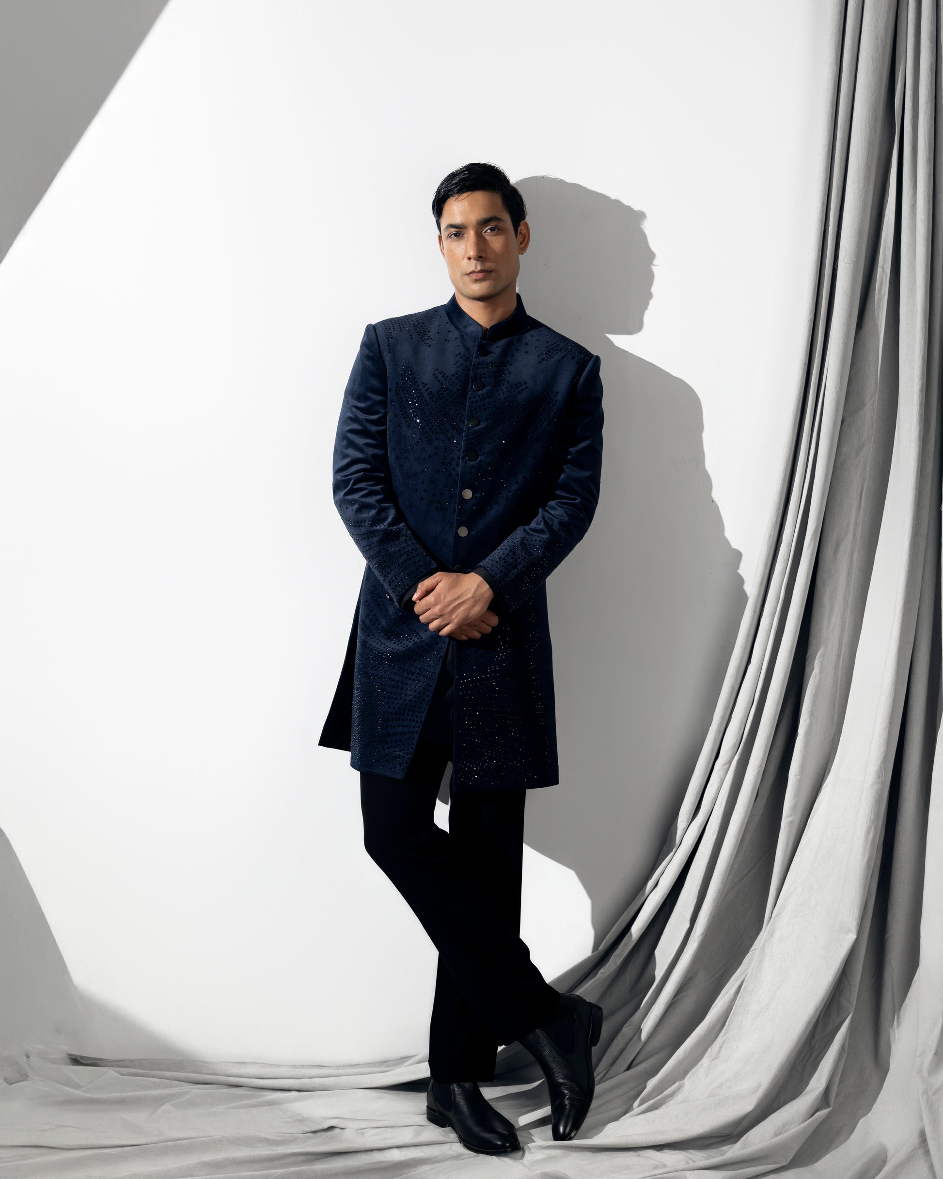 DARK BLUE VELVET STONE EMBROIDERY INDOWESTERN SET