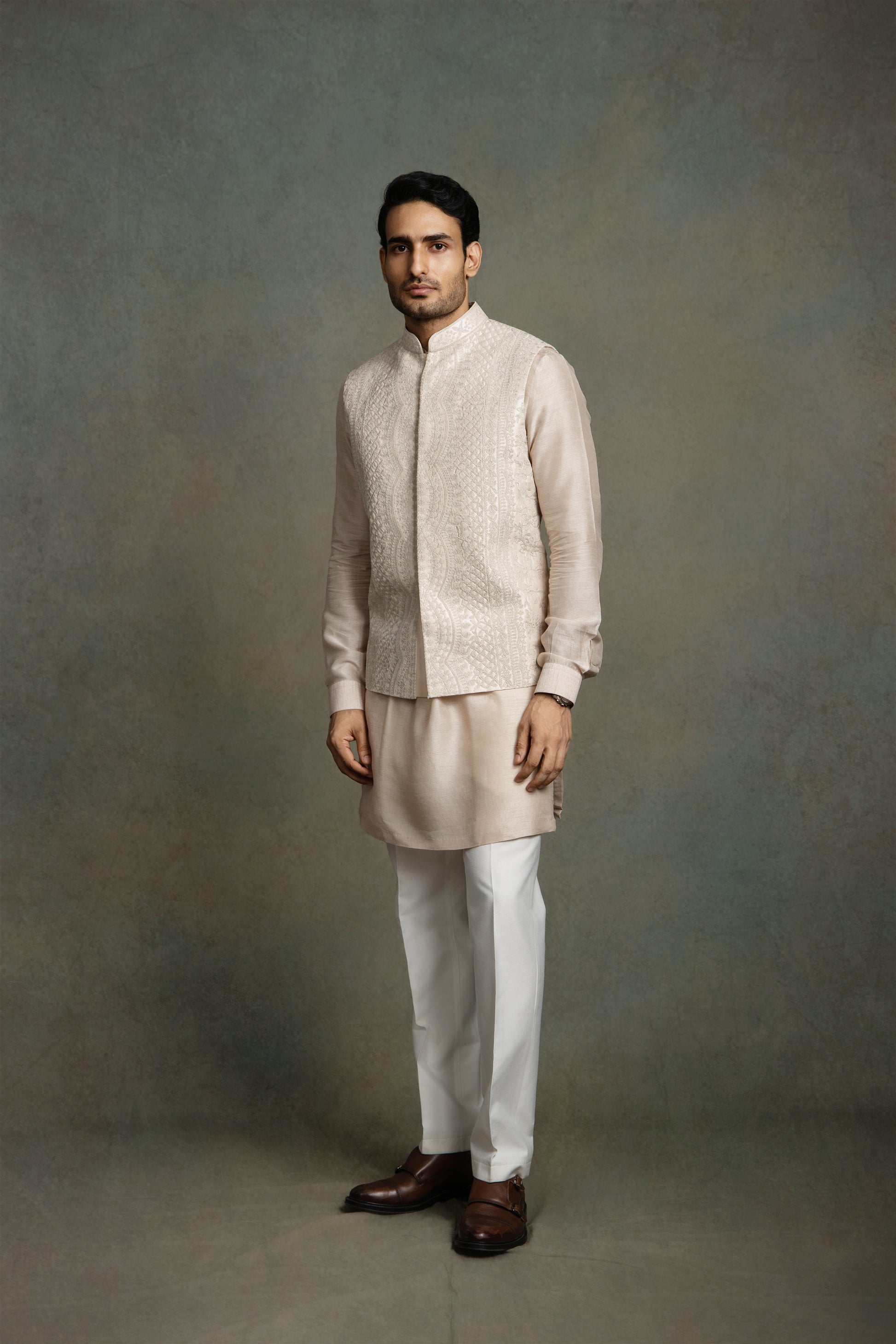 DUPION SILK JACKET WITH DOLA SILK KURTA AND OFF WHITE COTTON SILK PANT