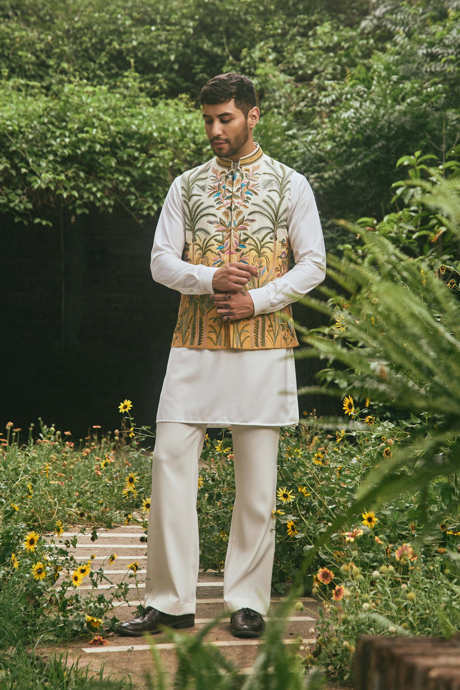 OMBRE DUPION SILK JACKET WITH COTTON VISCOSE KURTA AND OFF WHITE COTTON SILK PANT