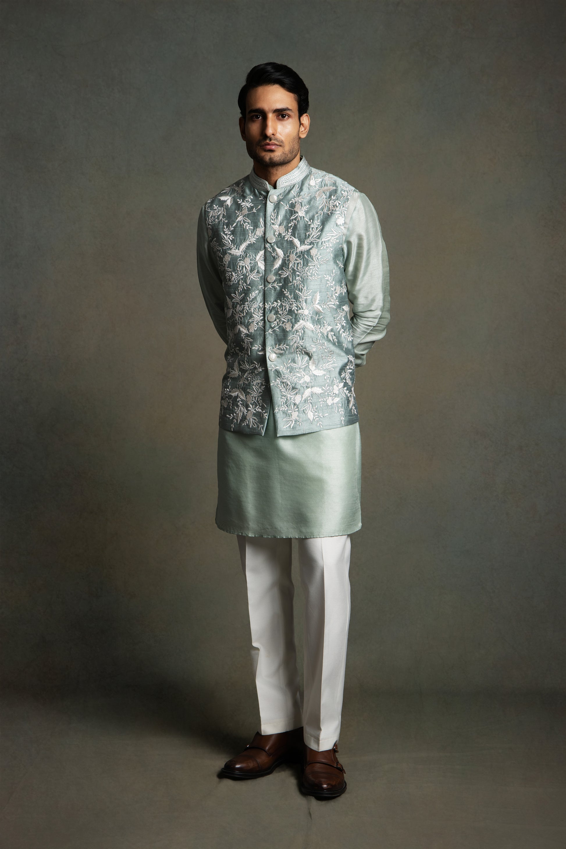 PASTEL OLIVE SILK THREAD EMBROIDERY NEHRU JACKET SET