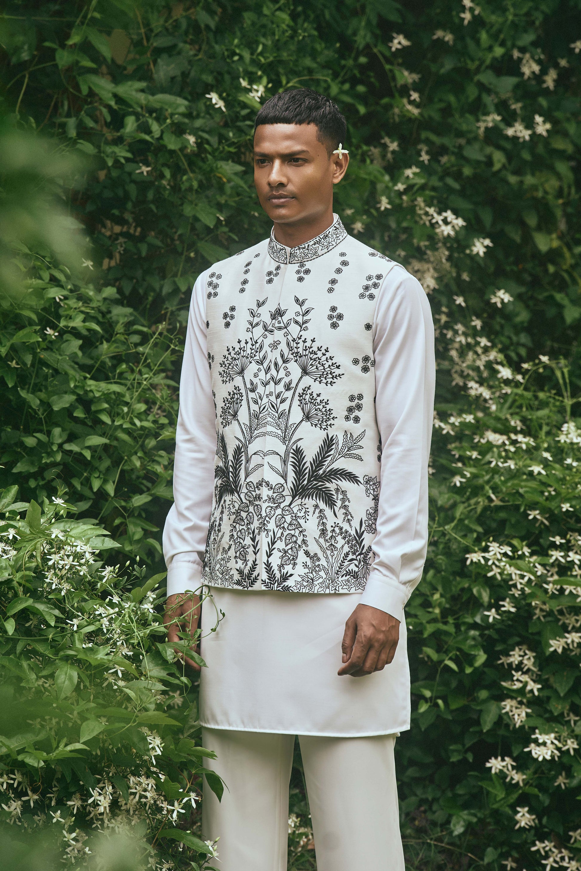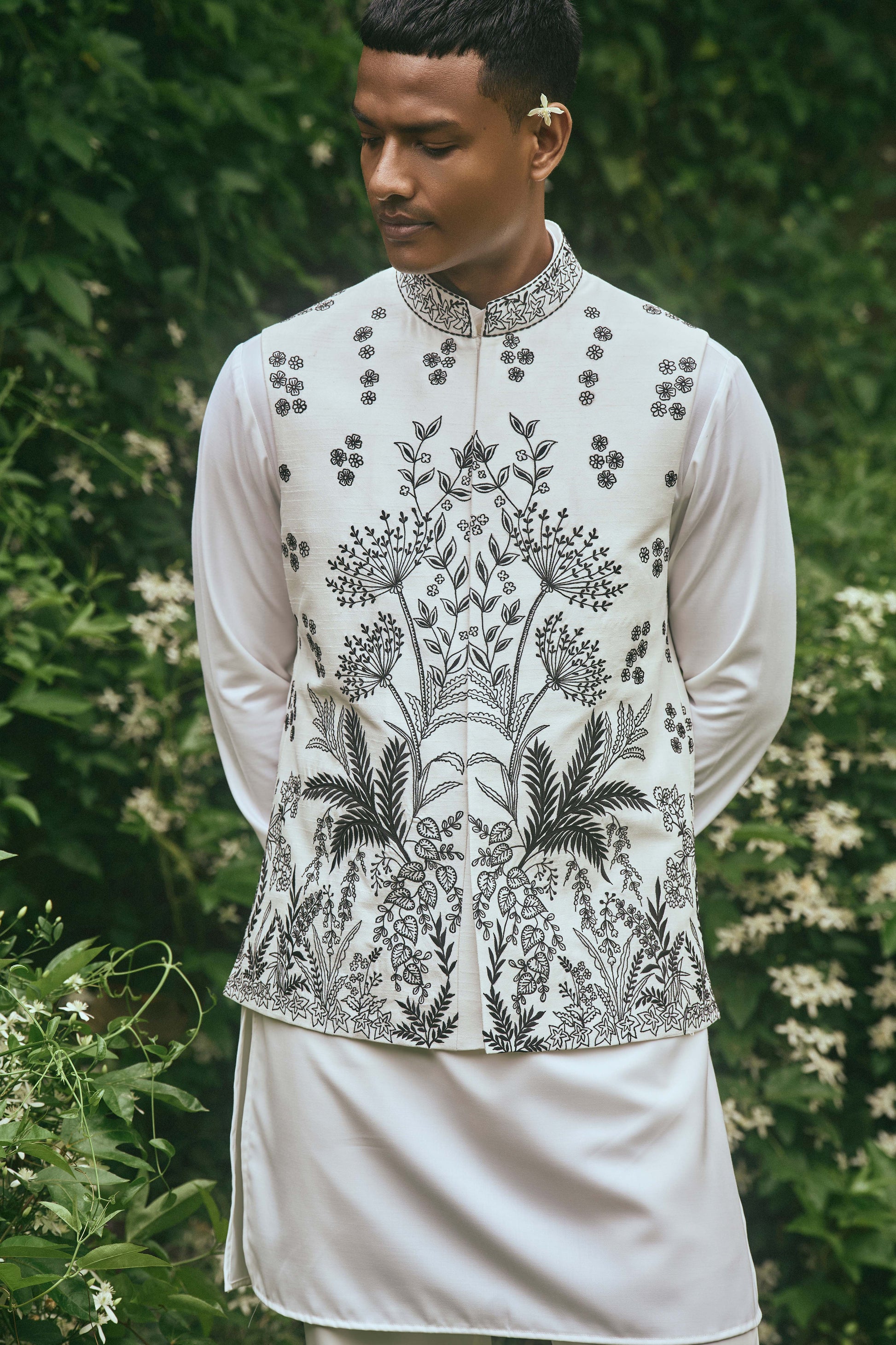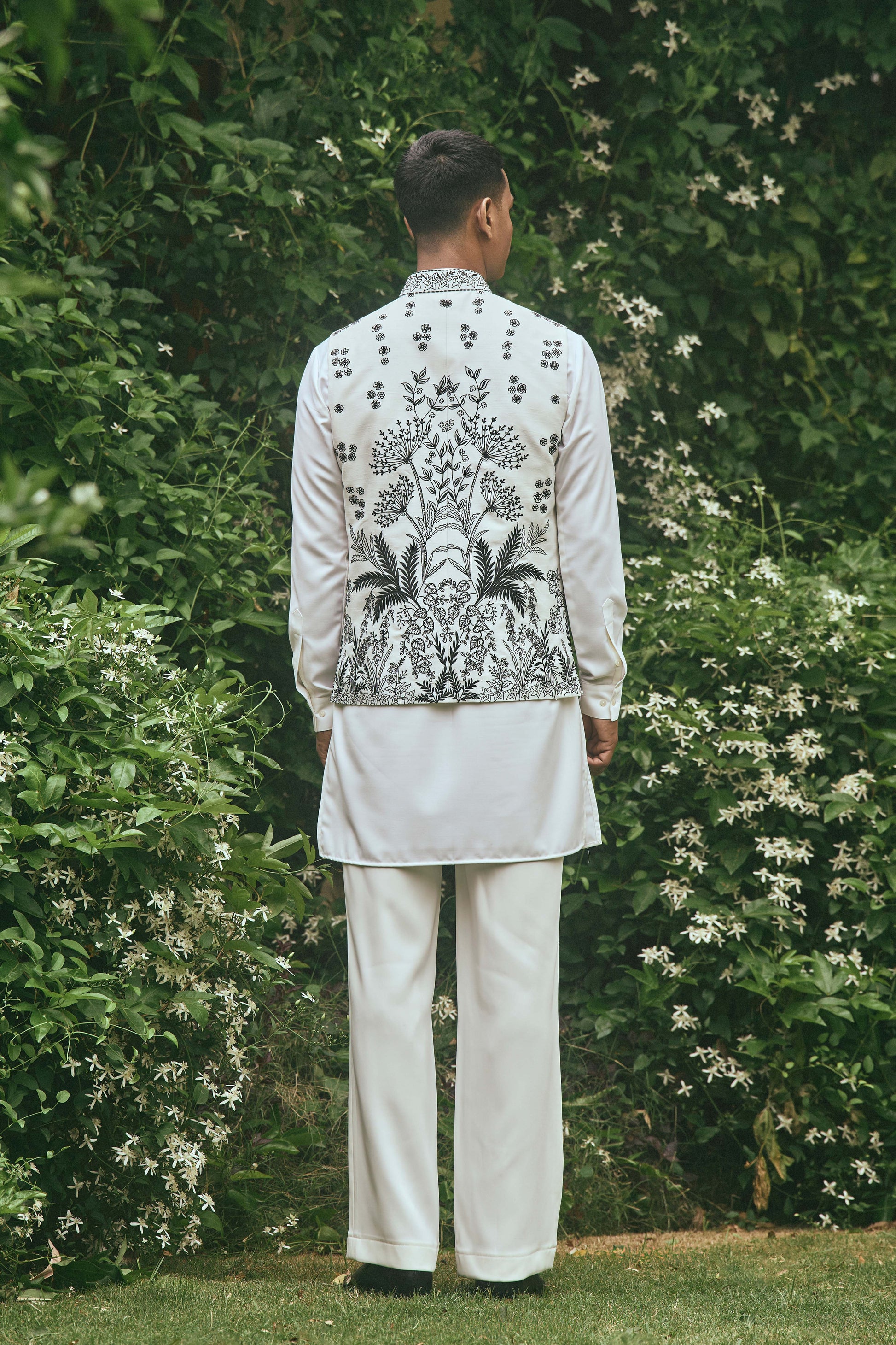 WHITE BLACK EMBROIDERY NEHRU JACKET SET